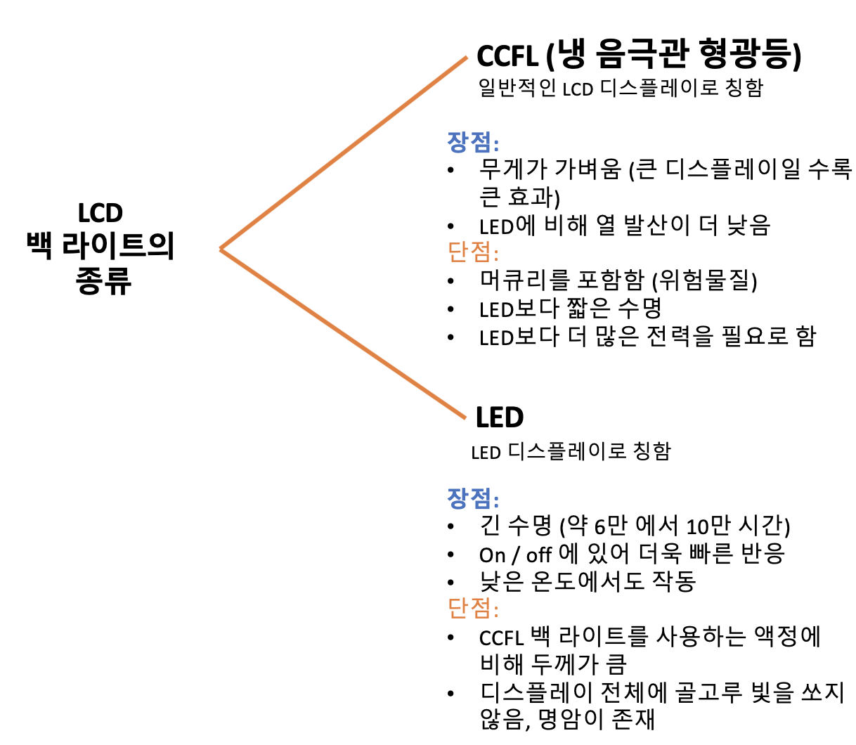 일반적으로 LCD화면이라 함은, CCFL 백라이트를 사용하는 LCD 디스플레이이며,