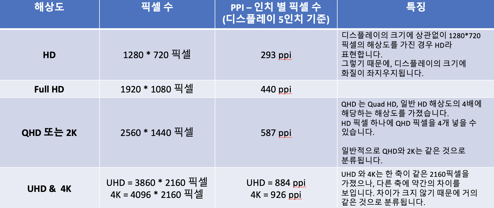 PPI(Pixel Per Inch)라고 해서, 디스플레이 인치별 픽셀 수로 해상도를 판단할 수도 있습니다.