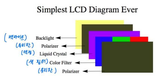 위의 그림 처럼, LCD 디스플레이는 2개의 유리판 사이에 액정과 색필터가 있으며, 맨 뒤에는 백라이트가 있습니다.