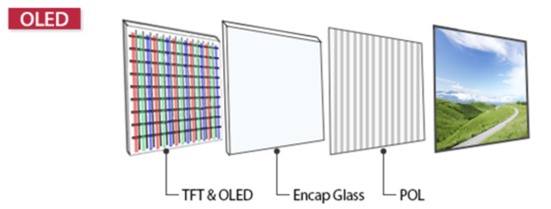 OLED는 LCD와 달리 많은 계층을 (백 라이트 포함) 필요로 하지 않기 때문에, LCD보다 더 얇게 만들 수 있는 것이 특징중 하나입니다.