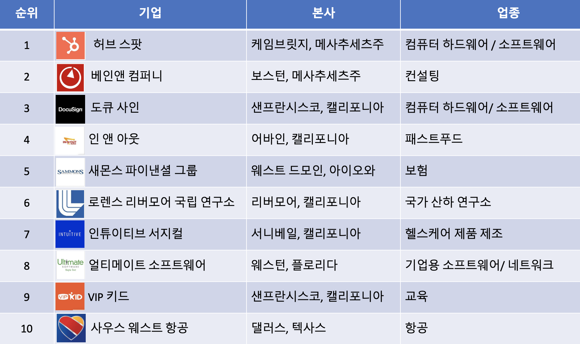 아래는, glassdoor에서 선정한 "가장 일하기 좋은 회사" Top 10입니다.